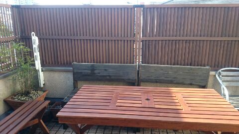 2015年04月第五週04/27-30 2015年04月30日(木) 「ベランダ改装」 日常 10年も住むと、家もボロボロになってくる。 玄関の上がり口は、生徒が踏みすぎてボロボロになってるし。 1Fや階段の壁は、みんなが服をこすりつけて、黒くなってるし。笑 そのへんは、あまり見ないようにしてるけど。笑 3Fベランダは、9年前に作ったBBQテーブルは去年に廃棄した。 今年は、ベランダのラティスを変えて改造することにしたのだ。 夕方前に箱根から戻って、ルーバー式のフェンスに色も塗って、完成させたよ。 総額7万円、改装日数3日、できあがりましたよ。 これで、GWはベランダ改装記念バーベキューができる。 改装も終わり、肉の発注も終わり、さあカモーン、GWとみんなの笑顔。笑