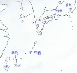 石垣直行なら、飛行機飛んでたのにね〜と伝えた。 しかし、石垣と那覇の位置関係がよく分かっていないらしい。 石垣と那覇の間が、大阪と東京の間ぐらいあるんだよっ。 おいおい、自分が行くトコぐらい、分かってろよ!! オキナワっていっても、いろいろあるんだっつーの! 沖縄本島、慶良間諸島、宮古、八重山諸島、与那国...。 西表は台湾の近くなんだよ、えっ、台湾も、ビミョウ?! 地図見るのって、ワクワク楽しいじゃんね〜!(^0^) |