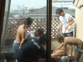 2006年08月02日(水) 「試練の夏・遊びの夏」 WILLING 昨日の夜は高校生たちが泊まり。 7時間で40問テストをどこまで合格できるかの、高校生英単語トライアルで疲れたのかな。 その場で1000個も単語を覚えることは不可能。 だから事前に覚え直しておいて、当日にトライすることとなる、試練の夏だ。 朝は用事がなかったらしく、泊まりの高校生たちはミョーにまったりしていた。 ワシの午前中は中学生の授業、連日ハードな日が続くワシ。 昼からテニスの予定が無理になり、中学生たちに焼きそばを作るハメに。 さらにヤツラは、ベランダで犬たちと水遊び...。 なんだか夏って感じだ、梅雨も明けてようやく夏がやってきた!!