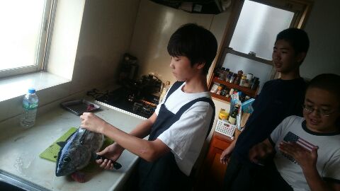 1階には、補習で残されている中学生が三匹。笑 「キハダマグロ、さばいてみたくないかい? 持って帰らせてあげるよ」笑 勉強がさぼれて何かが喰えるとなれば、彼らには一石二鳥だ。笑 てことで、1匹はまずお手本でさばいて、やり方を教える。 さあ、やってみよーーーー。笑 まんまと楽しそうにやっておった。笑 きっと家に持ち帰って、自分でさばいた魚だから楽しく美味しく食べれるだろう。 たまには、こういうのもイイな。 サンキュー、Sンちゃん。