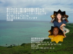 2004年12月11日(土) 「送別会、表の主役・裏の主役」 WILLING 5時、買い出しや料理をKヨ、Sギタ、Nモリン、ワシ、M保さん、掃除と飾り付けをT井が担当する。 夜7時、来週サンディエゴに留学するNモリン送別会に11人が集う。 7時半:さよなら浪人生K太郎、9時半:睡眠脱落M保さん、11時さよならSギタ...。 12時:つぶれたT井&Yマちゃん、いつのまにかワシとNモト、Aキ、Kヨ、K腹、S入の6人。 だんだん調子が戻ってきたワシだが、S入おやすみ〜、Nモリンダウン...、主役不在の宴に。 ところがここで裏の主役が登場した、もちろん両手に花・K腹の一人舞台だ〜。 主役がアメリカに旅発つことで、彼が主役に躍り出るナゾ!?、4時半まで彼が主役だったさ〜。 翌朝の2時間にも及ぶ掃除、Yマちゃん、Kヨ、ご苦労様でした。 いつの日か、K腹くんが掃除や料理や片づけしたりするのを一緒に見ましょうね。 そしてNモリン、アメリカで寂しいときやつらいときはワシのことを思い出してくださいね。 炭火焼肉食べて泡盛飲んでるワシの姿を思い出してね。 「ああ、人生、なんでもアリだな、ワハハ〜」ってね。(^-^v