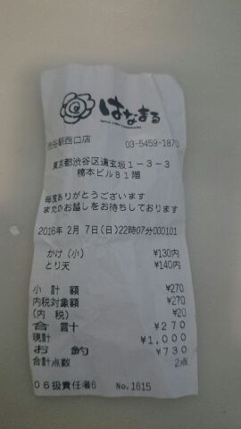 2016年2月第二週02/08-14 2016年02月08日(月) 「朝起きたら、タケシ、なぜに、、、」 日常 昨夜は、飲み仲間たちと渋谷で「ラム肉を食べる」宴会。 小学校の頃は肉類ほとんど食べれなかったワシが、成長したもんだ。 成長し過ぎか?笑 小学校の頃は牛肉の赤身だけ食べることができた。 中学で牛カルビデビュー、高校で鶏の唐揚げデビュー。 社会人になってからは、鶏のなんこつやら、少しずつ食べられるようになった。 赤ワインを飲むようになってからは、ラム肉も好きになった。 まあ、未だに食べられない肉は、ホルモンやらレバーやら豚肉やら多いけどね。 そうじゃないんだって!、今日の本題は。 飲み過ぎて記憶なくして、9時にカラオケ行くときに仲間とはぐれてしまったのだよ。 どうやって帰ったかも、そもそもラム肉の店の会計すら覚えていない。 そして朝起きたら、一枚のレシートを発見してしまったのだ。
