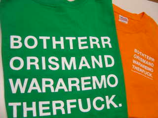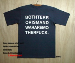 BOTH TERRORISM AND WAR ARE MOTHERFUCK.(戦争もテロもくそくらえ) さあ、みんなもエルトポオンラインショップでTシャツを買おう〜。 これだけ書けば、もしかしたらBINGOの景品にTシャツ1枚くれるかもしれないぞ。(笑)