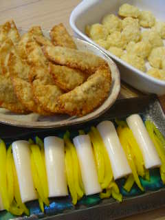 2006年06月18日(日) 「クロアチアを喰っちまおう笑」 日常 4年前のワールドカップは、対戦国の料理を作って食べて観戦したことを思い出す。 クロアチア料理を下調べしたが作るのが難しそうだ。 ネット注文できるサイトを発見、ふふふ、お調子者だから注文しちゃったよ。 ○サタラス(ミネストローネのような野菜スープ) ○サルマ(米入りロールキャベツ、ザワークラウト風味) ○エビと魚介のブザラ(アドリア海のブザラソース、ペンネと一緒に食べちゃおう) ○シュトゥルクリのタルト(ラビオリ状のパスタ入りクリームタルトオーブン焼) ○チェヴァピ(トルコのケフタと同じような皮なしラム肉ソーセージ香草焼) ○グラーシュ(パプリカたっぷり、牛肉のシチュー) 自分でも作ってみたくてサラダと、ソース系に合いそうなクスクス、D好物のフライドチキン。 ○ゆでタコのサラダ(タマネギとの軽いマリネでクロアチアっぽい感じに) ○クスクスのサラダ(チュニジア料理だけど、クロアチア料理のソースに合いそう) ○フライド鶏もも肉、うるち米の粉を使ってモスチキンっぽく作ってみた) ○自家製フランスパン&ワインパン(とてもいいデキで感動〜) 本日は1人1000円でクロアチア食事会&観戦会、かなり豪華な宴となりました。 次は夜中4時のブラジル料理か...、またもや難関だな。(^-^; あれっ?、サッカーは???