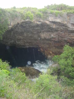 まずタンクを背負って、111段の階段を降り、波が通る岩場を抜けて、大きな岩に上がる。 この波が通る岩場の手前に、金属製の手すりがあるのだが、この手すりは、以前はなかったという。 数年前、韓国から来たダイバーの人が、この岩場で足を滑らせ、波にのまれ、亡くなった。 そのダイバーの遺族の方たちが、これ以上被害を生まないようにと、この手すりを設置してくれたらしい。 悲しみと愛に満ちた手すりをしっかりと握って、ワシらは岩に上がり、グロットの海を満喫した。