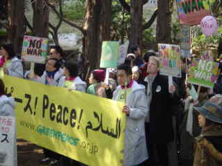 昨日のデモとは少し様子が違い、参加する人たちは、渋谷なのに、ワシらと同年代または年上の人が多い。 渋谷の街を「NO WAR!、NO MORE WAR!!、SOTOP THE WAR!」と叫びながら、練り歩く。 やはりここは土曜日の渋谷、人も多く、傍観的な人、写真を撮る人、手を振る人、様々な反応が見られる。 戦争が繰り広げられる中、ワシらのデモは自己満足だけで終わってないだろうかと疑問がよぎる。 テレビで見る世界のデモは、人数も規模も大きく、そしてなによりも若い人たちが多い。 反戦、反体制というものは、無謀にも思えるような若さと思想が立ち向かっていったものではなかっただろうか。 これでいいのだろうか...、これでいいのだろうか...。 ワシ自身、もっとみんなにしっかりと呼びかけることができるのではないだろうか。 この戦争の終わりを願いながらも、ワシ自身が考えなければならないことには、終止符を打てない。