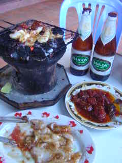 炭火網焼きだなんてステキー!、牛もうまいが、イカがプリプリしていていい味付けなのである。 しかしワシの本当の目的は違うのだ、市場から直接買い付けるロブスターである。