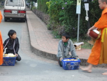 中に入れているのは、お米だったり、お菓子だったり、お金を入れている人も。 見学する旅行者の人たちもたくさんいる、旅行者で寄進している人もいる。 のんびり見ていると、托鉢の托鉢をしている子供たちも発見。 僧侶の人たちがもらったものを、カゴを持って追いかけてもらっている。 よく見ていると、さらに托鉢の托鉢の托鉢をしている犬も発見。 子供たちからおこぼれをもらっている。 なんだかのどかな街ルアンパバーン。 午前中にガイドブックに載ってるお寺巡りや、プーシーという小さい山に登ったり。 一通り廻ったら地図も理解して、のんびり旅にできそうな気がしてきた。 ラオス、居心地が良すぎる。