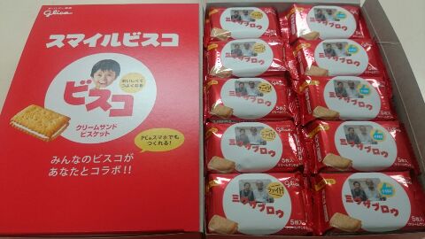 2016年5月第三週05/09-15 2016年05月09日(月) 「ビスコでミワザブロウ」 日常 先日、酔っぱらってコンビニに入ったらビスコを発見。 乳酸菌1億個とか書いてあって、こんな古いお菓子も進化してるんだなあと思った。 試しに買って食ったら、なんだかウマい。 外側のクッキー部分?も柔らかくなって、美味しくなっていた。 ビスコみたいな昔からあるお菓子も、生き残るために工夫されてるんだなあ。 ネットでビスコを調べてみたら、面白いものを見つけた。 ビスコのパッケージに写真を自分で入れたり、文字を入れたりできるらしい。 前に、ラッシュとパティの写真でチロルチョコ作ったなあと思い出した。