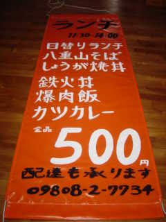 2002年11月03日(日) 「なぜか、垂れ幕を書かされる」 旅 今回の石垣の目的は二つ、一つはマンタ、一つはワシの親友Yぶーの生活ぶりを見ることである。 マンタは、こけた...、Yぶーの生活ぶりは見た。 となればあとは、のんびり八重山を楽しむ...ハズだった。 Yぶー「店がランチ始めるんだよねえ。たあくん(彼はワシのことをこう呼ぶ)、字書くの得意だよねえ」 えっ、むむむっ、怪しげな雰囲気、これは、いかん、やばいぞ絶対...。 「なんか前にもチョロチョロッと、港に帰ってくる友達の垂れ幕、作ったよねえ。」 うっ、危険信号満載、これはマズイ。 ワシはまだ、八重山の三線の音色さえ聴いていないというのに...。 (すでに準備された垂れ幕をワシの前に差し出しながら)「これに、ささっとメニュー書いてくれんかな?」 えっ、これ、いつから用意してたんだろ?、縫い合わされてる!、てことは少なくとも1週間以上前?!