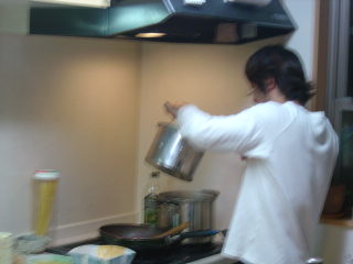 2005年11月26日(土) 「名古屋に行くU田氏を送る会」 日常 今週の土日は、二つの大きなイベントが予定されていた。 土曜は、名古屋に引っ越しする元しゃぶしゃぶ屋S樹バイト仲間だったU田くん送別会。 彼とはウマが合い、2ヶ月のバイト仲間でしかなかったのに15年つき合いが続いている。 日曜は、周囲に秘密な結婚式をするM野くんのサプライズパーティだ。 彼も元S樹仲間で、オープンから店をたたむまでを共にしたかけがえのない仲間である。 ぶっちゃけ、この数日間は心が重い日々が続いていたので、まずは自分を奮い立たす。 本日のお品書きメインは、鶏ガラダシ5時間煮込み、タイスキだ〜。 定番前菜は、石垣まるーぐぁ揚、モヤシナムル、ベトナム煎餅のアジア系。 自分のお気に入りのアスパラとモッツアレラのプロシュート巻きも作っちゃおう。 前菜サラダはクレソンと蕎麦葉と柿の甘みを絡めてビネガー系のドレッシングで合わせる。 タコのパセリマリネ、生牡蠣、 牡蠣のペシャメルソースオーブン焼もどうぞ。 骨を抜くのに1時間かかったイサキはポワレにして焼き筍を添えよう。 ビーラーには、軟骨ユズ胡椒揚げもシルブプレ〜。 ワイン好きの方はパルミジャーノ&ブルサンで箸休めを。 さてメインタイスキは、今半の牛肉&豚肉を用意いたしましたでげすよ、うふっ。 タレは市販のタイスキソースを使い、香菜を山盛り入れましょう。 ワンタンや粗挽きソーセージも入れるとおいしいんだよね〜。 青梗菜やニンニクの茎、白シメジ、白菜などの野菜も入れてサイコー。 仕上げはタイ風っぽく、鶏ガラダシにチャルメラの麺で締め! 新しい出会い有り、東京での別れあり、プロポーズもアリの、今日の日は終わりを迎える。 明日からの新しい時間を迎える自分たちに乾杯!の時間でもある。