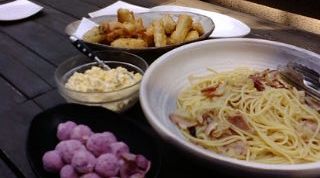 2010年10月13日(水) 「ランチ会タケッコロ」 WILLING 午前組と、試験中の高校生とランチ会タケッコロ。 ベランダ日和ですね、とても気持ちがいい天気。 紅芋ボールのサラダ、黒鯛と薩摩芋のフリッター with タルタルソース。 メインはタケシ定番(笑)、ベーコンのパスタ塩味。 このままベランダでのんびりしていたいけれど、それはムリっつーものだよ。笑