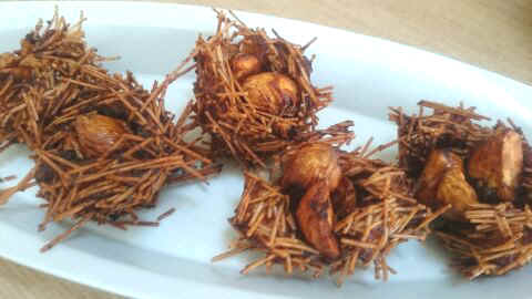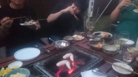 海老のすり身に下味をつけて、素麺を貼り付けて、中に栗を入れて揚げております。 前菜は☆チーズ豆腐withクラッカーが好評。 絹豆腐とクリームチーズと豆乳で作った自家製のチーズ豆腐、くせになりそう! ☆秋刀魚の玉葱ドレッシングカルパッチョ、☆秋鮭の南蛮漬け。 ☆手作り空豆コロッケ(美味しいよ〜)、☆小松菜のナムル。 主菜焼き物は、☆海鮮串焼き、☆タコ塩レモン。 焼き野菜は☆ズッキーニ、☆オクラ、☆蓮根、☆米茄子。 ☆鶏せせり、☆鶏もも肉with柚子胡椒、☆自家製バジルつくね、☆鶏レバー。 ☆牛タン塩、☆牛ハラミ、☆牛ホルモン、☆豚トロ。 ☆鶏手羽ニンニク醤油、☆合鴨むね肉、☆ソーセージ。 ☆カマンベール&バケットやら、Tちゃんパテやらアレコレあり。 後菜には☆秋刀魚の甘辛煮で☆焼おにぎり。 えっ?まだ食べる?、それならば☆牛テールの和風ビーフシチュー。 昼3時から夜12時まで食べっぱなし、飲みっぱなし。 そりゃ、太るよ...。